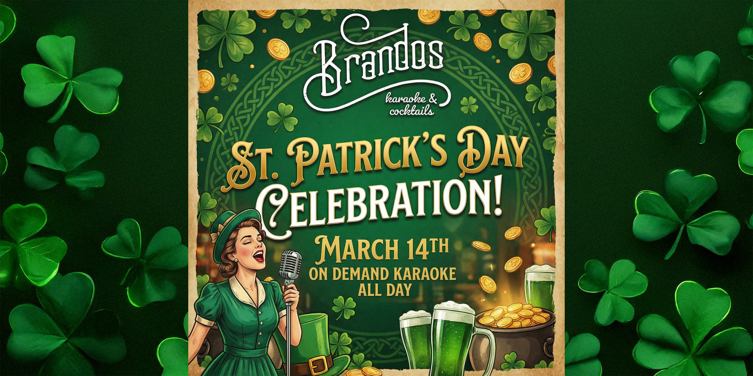 It’s easy to feel lucky at Brando’s during our St. Patrick’s Day party! Sing Irish Drinking songs (or whatever you like) with on-demand Karaoke all day and night. Open 9am-3am (both venues).